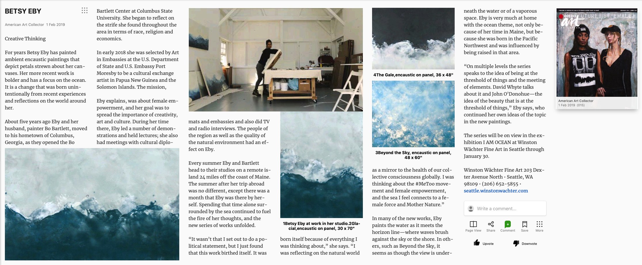 Betsy Eby received her BA from the University of Oregon and splits her time between studios in Columbus, Georgia and Wheaton Island, Maine. Her work has been exhibited widely throughout the United States and is included in several collections including the Tacoma Art Museum, WA; the Columbus Museum, GA; the Georgia Museum of Art, Athens, GA and United States Embassy in Dubai.