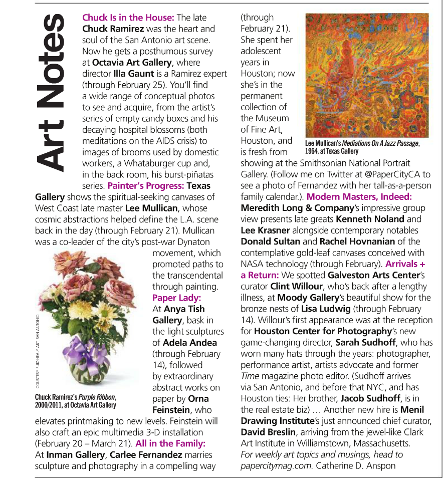 "Chuck Is in the House: The late Chuck Ramirez was the heart and soul of the San Antonio art scene. Now he gets a posthumous survey at Octavia Art Gallery, where director Illa Gaunt is a Ramirez expert (through February 25). You'll find a wide range of conceptual photos to see and acquire, from the artist's series of empty candy boxes and his decaying hospital blossoms (both meditations of the AIDS crisis) to images of brooms used by domestic workers, a Whataburger cup and, in the back room, his burst-pinatas series."